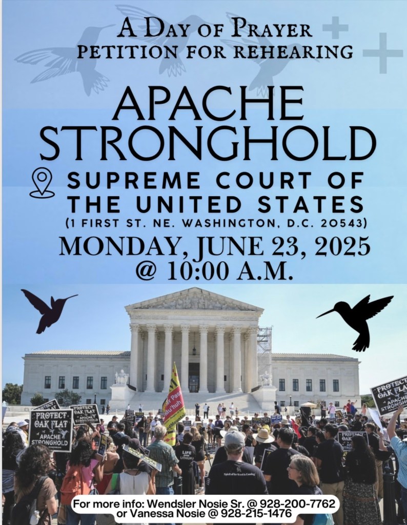 The fight to protect Apache Religious Freedom and the sacred land of Chi’chil Bildagoteel (Oak Flat) from destruction IS NOT OVER! Dr. Wendsler Nosie, Sr. and the Apache Stronghold will begin their journey to the Supreme Court on Thursday, June 19. We ask all our supporters to join with us in praying that the Supreme Court will reconsider its terrible decision not to hear our case.