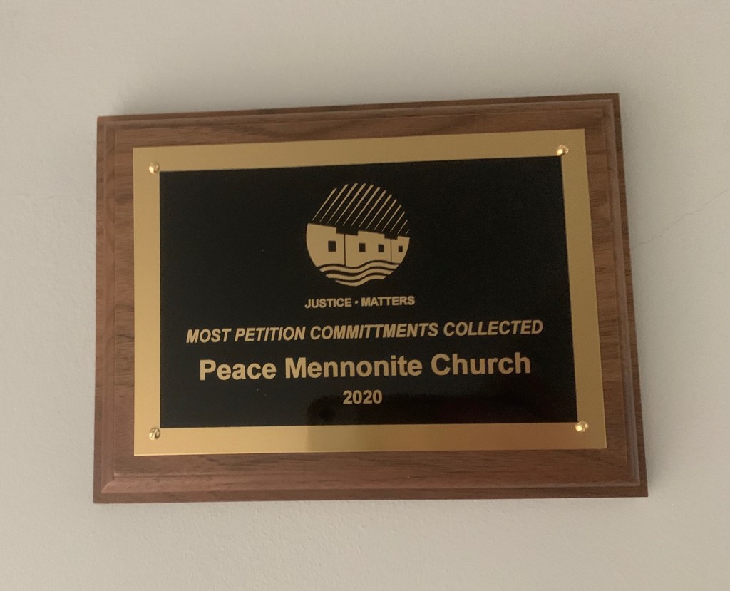 The Justice Matters team leaders wanted to share this exciting news from last Monday’s celebration: Peace Mennonite won the award for the highest percentage participation in the petition signature pledge drive. A number of Peace people equal to 98% of our average worship attendance texted “democracy” to 33777 and pledged to sign a petition–when it becomes available–to put the bond to finance the proposed jail expansion on the ballot. Good work, everyone! (For more information about the petition, see this video.)