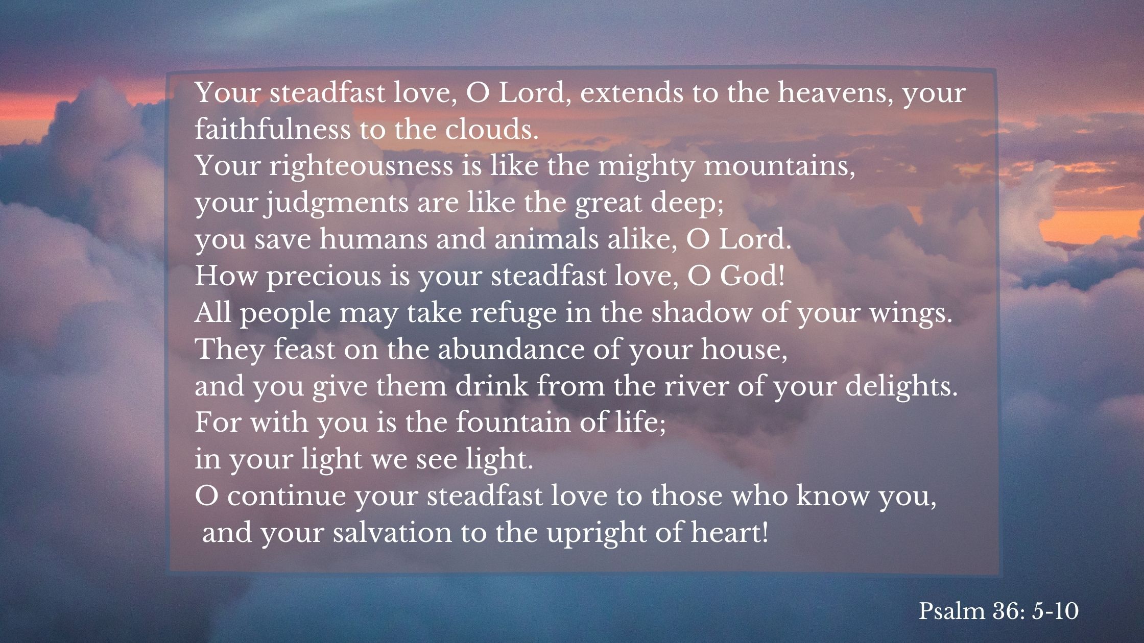 You are invited to offer your prayers to God. For what are you thankful this morning? What would you ask of God for yourself? Who do you know who needs God’s loving presence right now? What are your prayers for our community, our country, and our world?