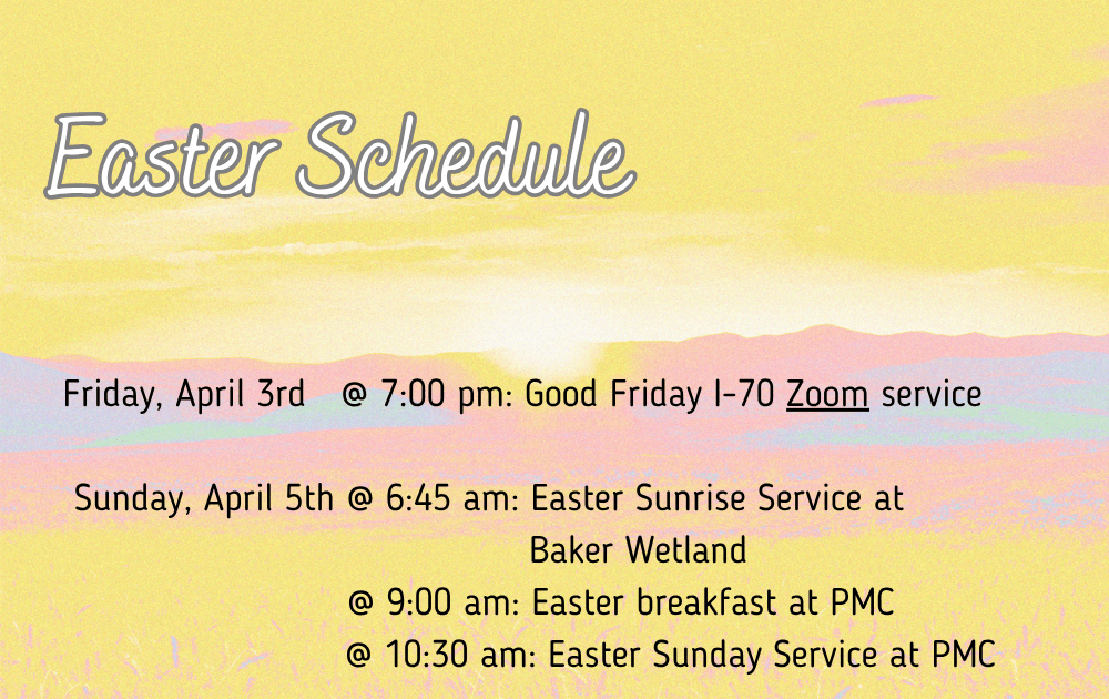 Peace Mennonite Church will participate with First Baptist Church and Vintage Church in an Easter sunrise service on Sunday, April 5, 6:45 am in the Baker Wetlands. There will be an Easter breakfast (9:00 a.m. @ PMC) signup sheet at the back of the sanctuary this Sunday.