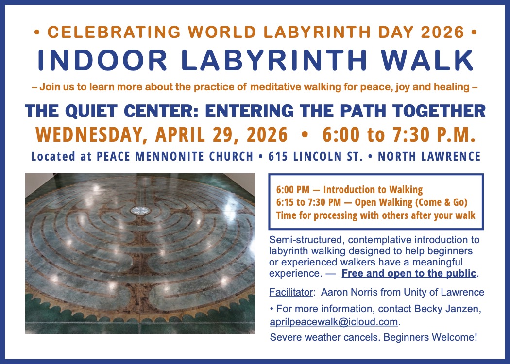 Your regular financial contributions to Peace Mennonite as well as contributions to the church benevolence fund (to help those with financial difficulties) can be mailed to the church (PO Box 451, Lawrence, KS 66044) or online. (Please indicate if the money is intended for the benevolence fund.)